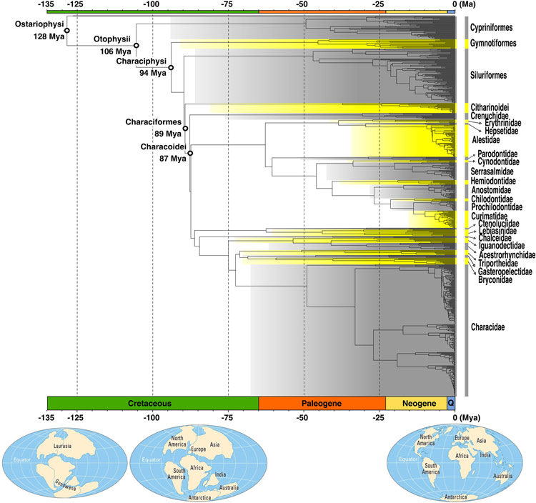 Ces conclusions sont en outre corroborées par la contraction de la ceinture tropicale, qui a commencé à la fin du Crétacé et s’est poursuivie tout au long du Paléogène. Nos résultats confirment la divergence entre les Cypriniformes et les Characiphysi comme conséquence de la rupture entre la Laurasie et le Gondwana. L’origine des Characiphysi remonte au Gondwana occidental, et l’expansion ultérieure du groupe ne peut s’expliquer sans invoquer une dispersion transcontinentale au cours du Crétacé supérieur-Paléocène.