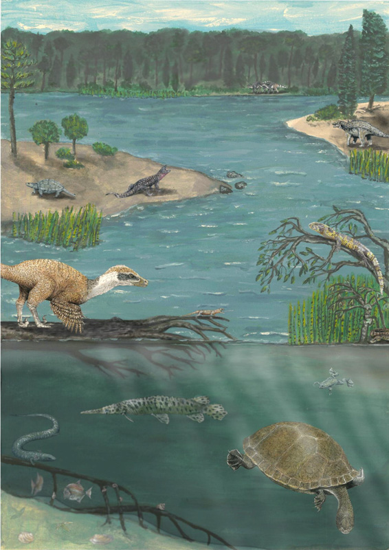 Reconstruction of this rich Late Cretaceous floodplain ecosystem (~80 million years ago) from Villeveyrac comprising several emblematic taxa in the various links of this food web. (Copyright O. Jansen & X. Valentin 2026)