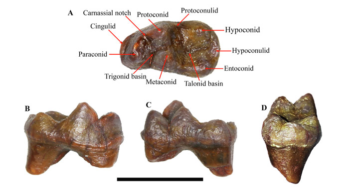 Fig. 2. Mioparadoxurus micros nov. sp., holotype, PUPC 16/414, right m1 in occlusal (A), buccal (B), lingual (C) and distal (D) views. Scale bar: 10 mm.