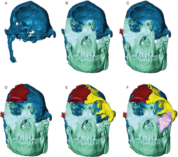 Fig. 2. — Reconstruction of the face of StW 573. The braincase and right ramus in blue (A) are aligned with the maxilla and the rest of the mandible in green (B). The portion of the right zygomatic arch in red is refitted to the temporal and zygomatic bones (C). The right frontal bone in dark red is positioned to fit with the maxilla (D). The left frontal bone and zygomatic in yellow (E) is repositioned to fit with the other blocks. The intact right maxilla is mirrored to reconstruct the left maxilla in purple (F). Credits: A. Beaudet.